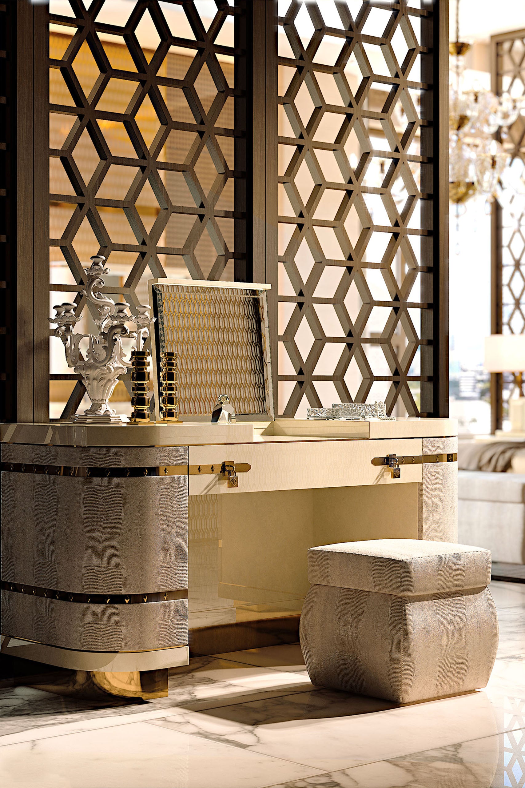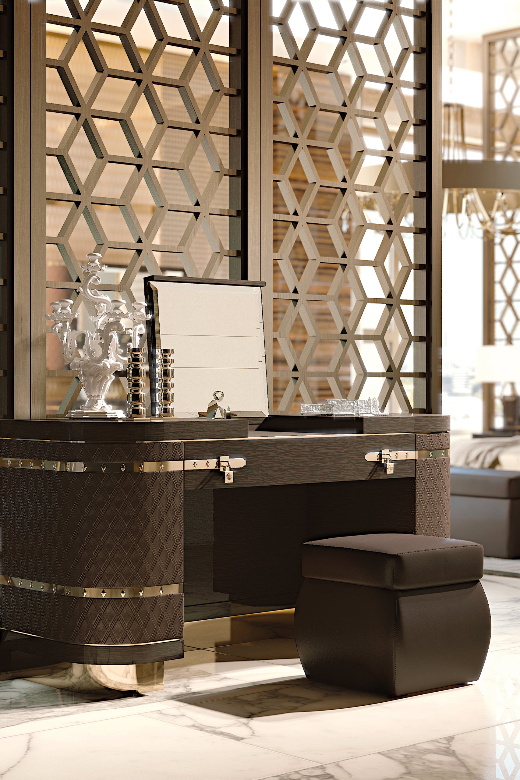 Bộ sưu tập Diamond bao gồm bàn trang điểm và ghế đôn sang trọng, kết hợp giữa thiết kế thanh lịch và tiện dụng. Bàn trang điểm làm từ gỗ bóng, các cạnh bọc da cong, ngăn kéo giữa ẩn gương nghiêng, cùng khóa, chân và chi tiết kim loại vàng tạo điểm nhấn sang trọng.