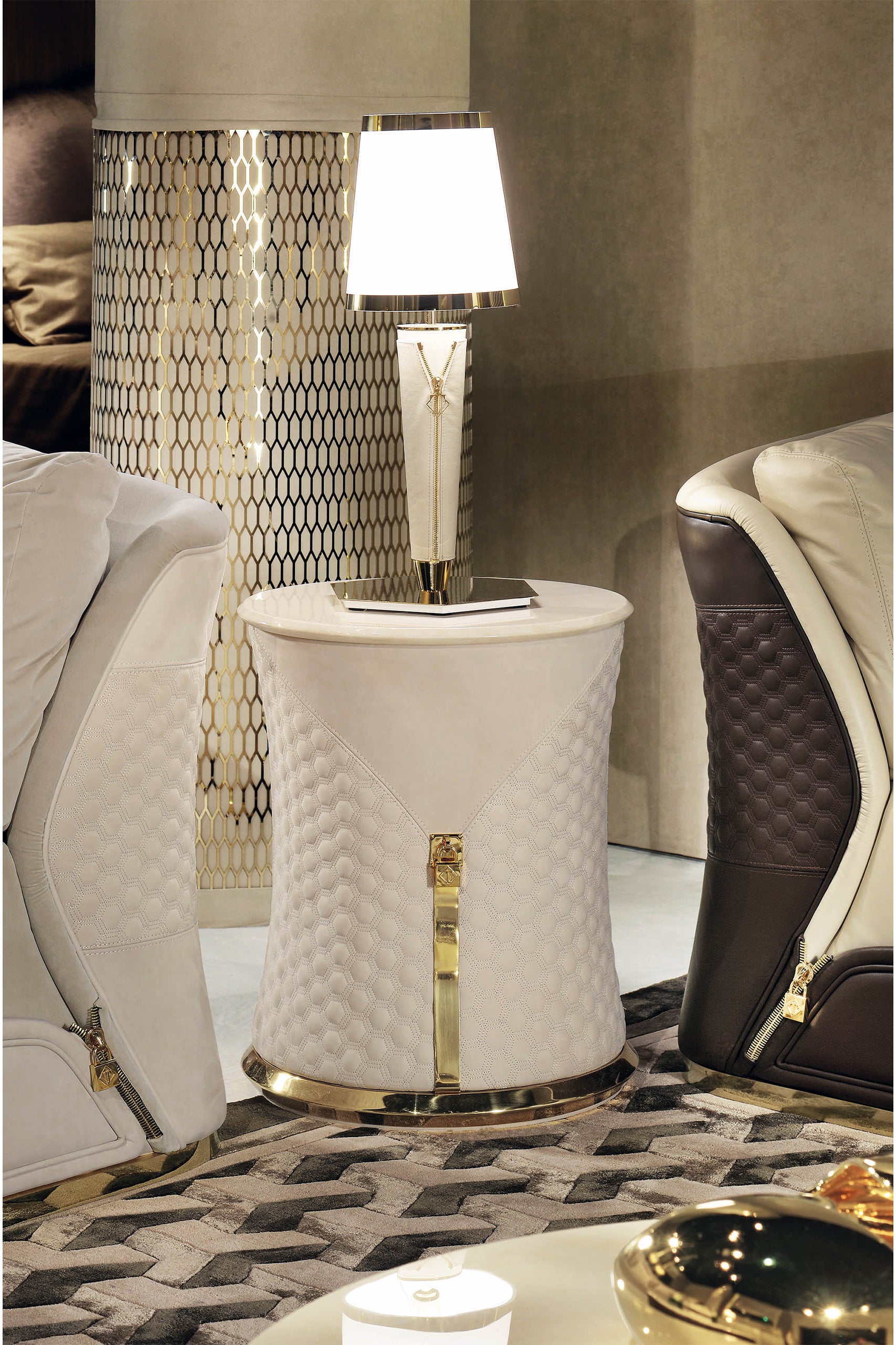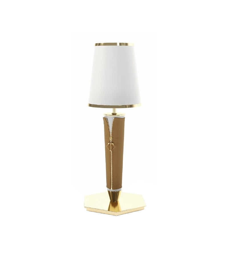 Đèn bàn Vogue mang vẻ đẹp thanh lịch và độc đáo, được nhấn nhá bằng khóa kéo và mặt dây treo mang thương hiệu. Chụp đèn được tô điểm bằng các chi tiết kim loại vàng sang trọng, tạo nên tổng thể tinh tế và cuốn hút.