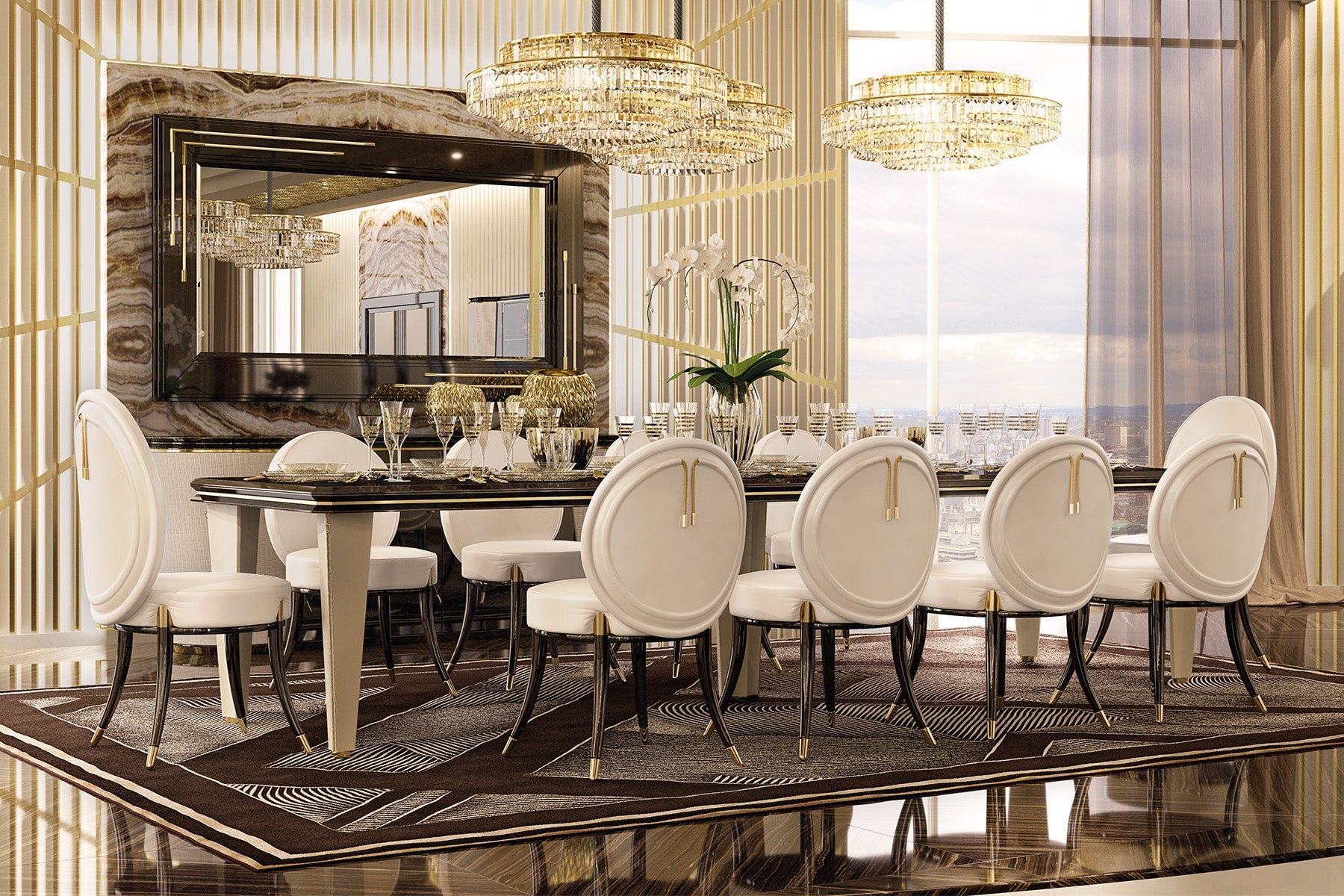 Turri – biểu tượng của nội thất Ý xa hoa từ năm 1925 – chinh phục giới thượng lưu bằng những thiết kế tinh xảo, sang trọng vượt thời gian. Mỗi sản phẩm là sự hòa quyện giữa nghệ thuật thủ công Ý và vật liệu thượng hạng, tạo nên chuẩn mực về chất lượng và thẩm mỹ. Chiếc ghế từ bộ sưu tập Noir có khung gỗ được bọc da, với các chi tiết trang trí bằng đá quý tạo điểm nhấn cho tựa lưng. Với kiểu dáng đơn giản nhưng uốn lượn, chiếc ghế tôn lên vẻ đẹp cho phòng ăn nhờ các chi tiết kim loại mạ vàng nhạt.