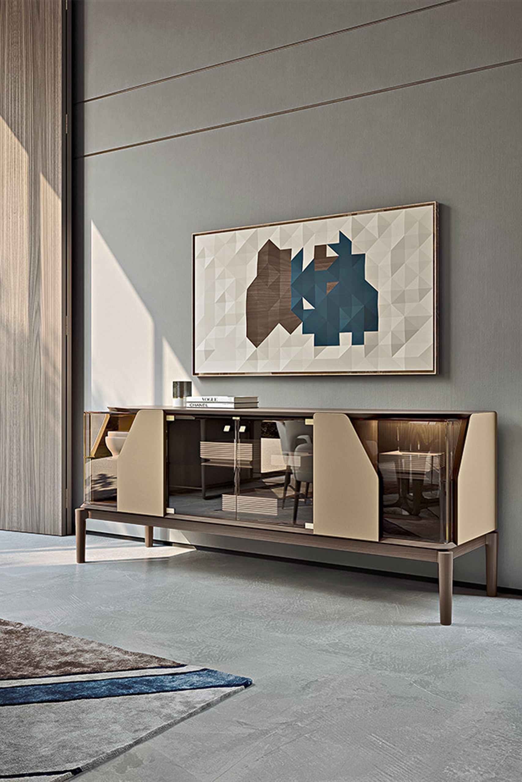 Tủ buffet Vine nổi bật với cấu trúc gỗ kết hợp các chi tiết kính tạo nên sự đối lập thú vị giữa các khối đặc và khoảng trống, giống như một thiết kế kiến trúc. Các ứng dụng da trên khung và cửa tủ làm tăng thêm giá trị cho thiết kế lưu trữ này, đồng thời tủ còn được trang bị đèn LED chiếu sáng bên trong.